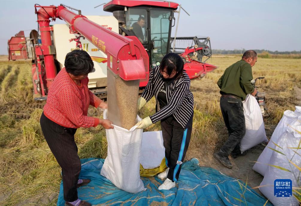10月23日,河北省昌黎县刘台庄镇的农民在将收获的水稻装袋。