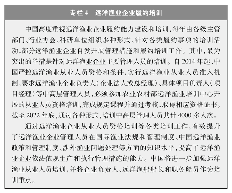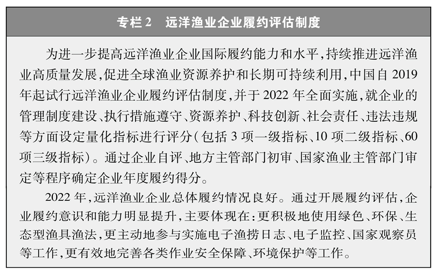 远洋渔业企业和渔船是履行国际公约、合法合规从事渔业生产的主体。2022年中国正式实施远洋渔业企业履约评估制度,将企业履约成绩与行政审批、政策支持等挂钩,通过正向激励、反向倒逼的方式,引导企业不断完善管理制度,严格执行管理措施,避免发生违规行为,切实提高履约能力。这一制度有力促进了远洋渔业企业规范管理和国际履约,得到了各方关注和广泛认可。