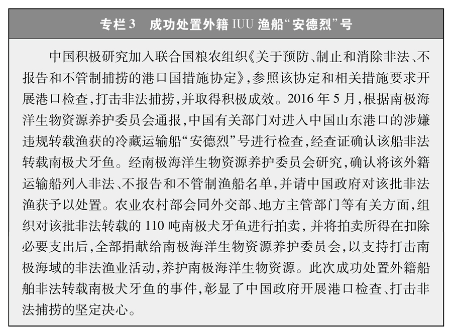 坚决支持并积极配合国际社会打击各种非法渔业活动。2020年起,中国每年派遣执法船赴北太平洋公海开展渔业执法巡航,查处违规作业行为。2016年,配合南极海洋生物资源养护委员会成功扣押处置了一艘外籍渔船非法转载南极犬牙鱼案件。2018年起,将中国加入的相关区域渔业管理组织公布的非法、不报告和不管制渔船名单通报国内各港口,拒绝此类渔船进港以及卸货、补给、加油等活动。