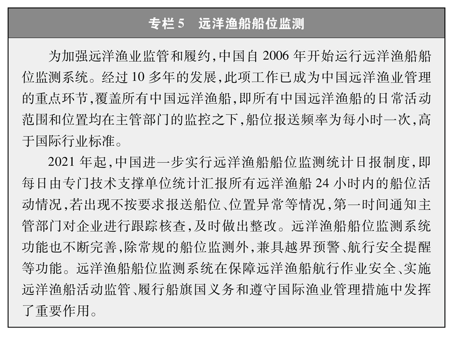 中国严格落实区域渔业管理组织养护管理措施,对北太平洋、南太平洋等区域以及金枪鱼、鱿鱼等重要品种的生产活动制定和实施专门管理措施,切实加强公海渔业监督管理和国际履约。对中国远洋渔船作业较为集中的部分公海海域,2021年首次实施远洋鱿钓渔船总量控制管理制度,重点加强无区域渔业管理组织管理的远洋鱿钓渔船管理,合理优化作业渔船布局,规范渔船生产作业秩序,积极履行船旗国勤勉义务。