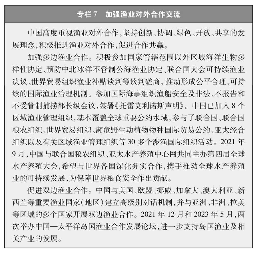 当前,渔业资源的持续利用面临气候和环境变化等威胁,渔业资源的跨区域分布、流动性和洄游性也呈现出新的特点,决定了渔业管理必须进一步加强国际合作。中国深入践行海洋命运共同体理念,深化远洋渔业对外交流,多渠道、多形式开展互利共赢合作,不断巩固多双边政府间渔业合作机制,助力合作国家和地区渔业发展。