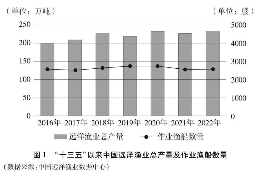 2022年,中国拥有经批准的远洋渔业企业177家,远洋作业渔船2551艘(其中公海作业渔船1498艘),作业区域分布于太平洋、印度洋、大西洋公海和南极海域,以及相关合作国家管辖海域,年产量232.8万吨。