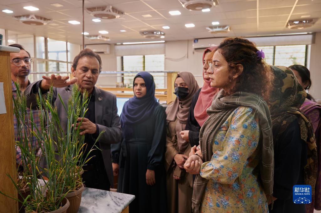 在巴基斯坦首都伊斯兰堡真纳大学的中国-巴基斯坦小麦分子育种国际联合实验室内,助理教授阿韦斯·拉希德正在为学生答疑解惑,讲述小麦分子育种的相关知识。