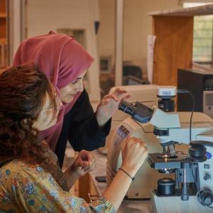 10月19日,在巴基斯坦首都伊斯兰堡真纳大学,巴基斯坦国家农业研究中心高级研究员扎希德·马哈茂德(左)在中国-巴基斯坦小麦分子育种国际联合实验室内和学生交流。 新华社记者 唐斌辉 摄