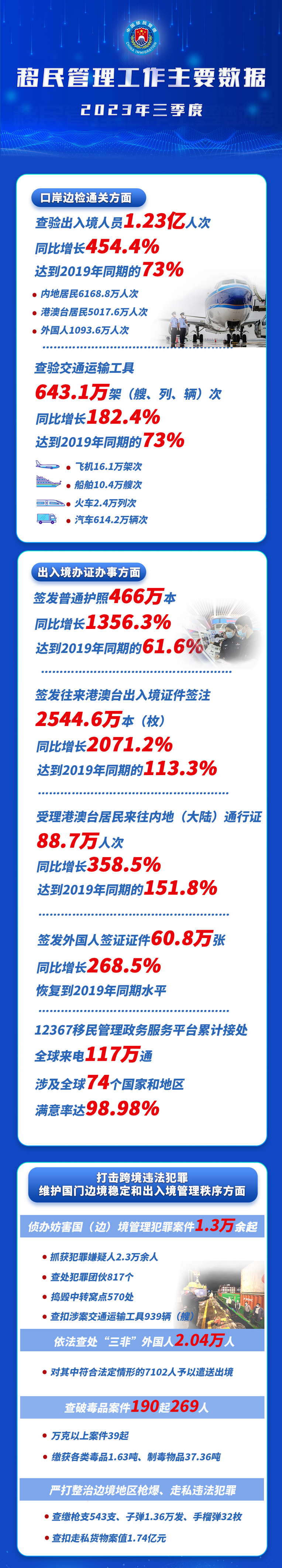 新华社北京10月24日电(任沁沁、朱思明)今年第三季度,全国移民管理机构共查验出入境人员1.23亿人次,同比增长454.4%。这是国家移民管理局24日在京召开的新闻发布会上通报的。
