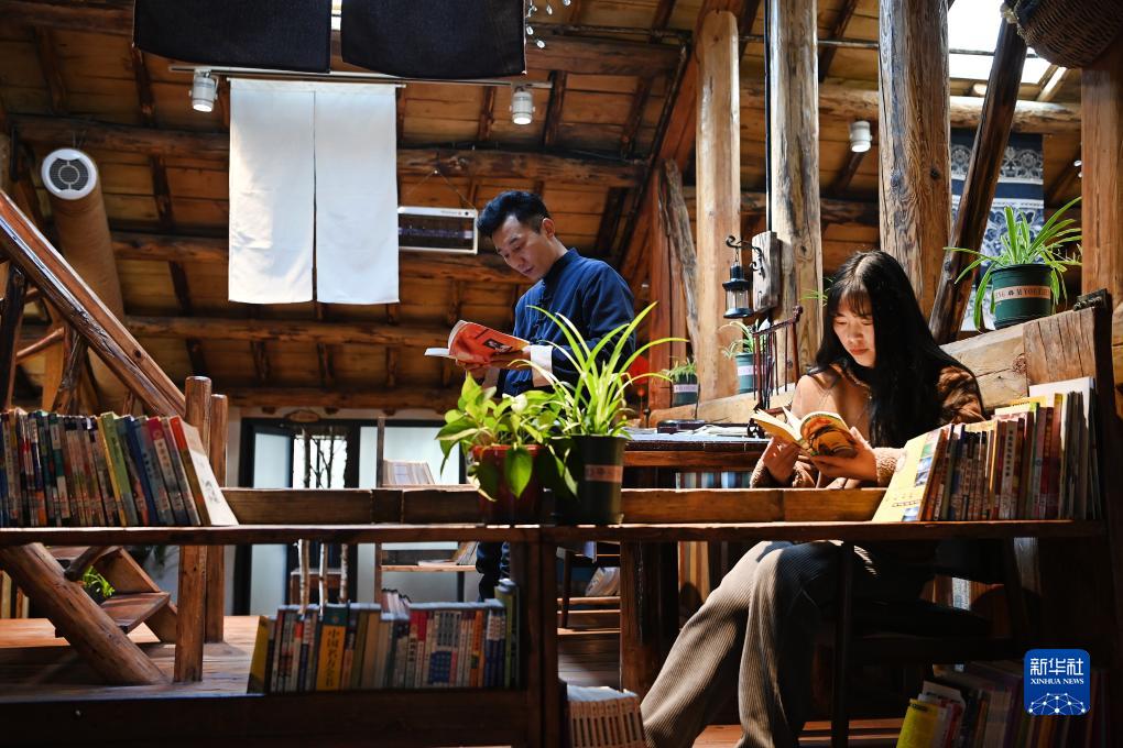 游客在朱家湾村一家民宿书吧内阅读(3月3日摄)。
