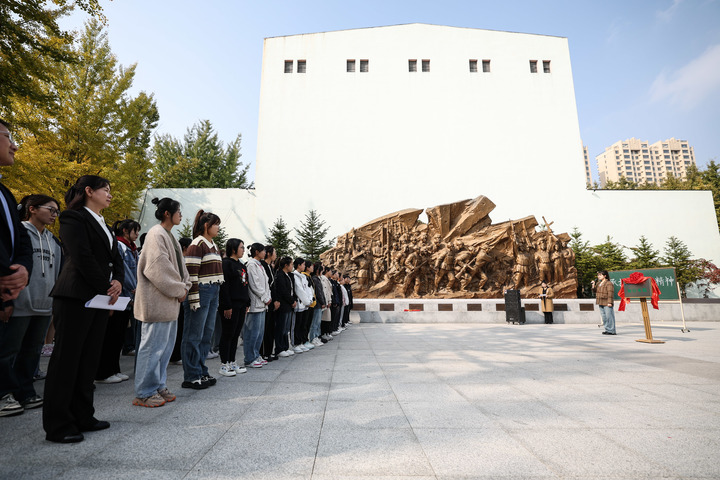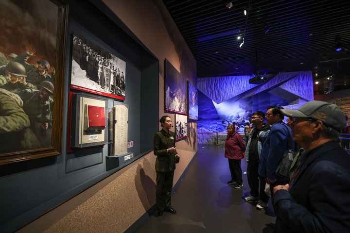10月24日,辽东学院毕业生、现任抗美援朝纪念馆讲解员姜玥(左)为参观者讲解。新华社记者 潘昱龙 摄