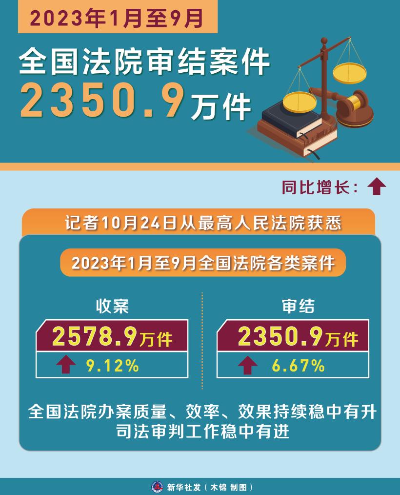 新华社北京10月24日电(记者齐琪)记者24日从最高人民法院获悉,2023年1月至9月全国法院各类案件收案2578.9万件,同比增长9.12%;审结2350.9万件,同比增长6.67%。全国法院办案质量、效率、效果持续稳中有升,司法审判工作稳中有进。