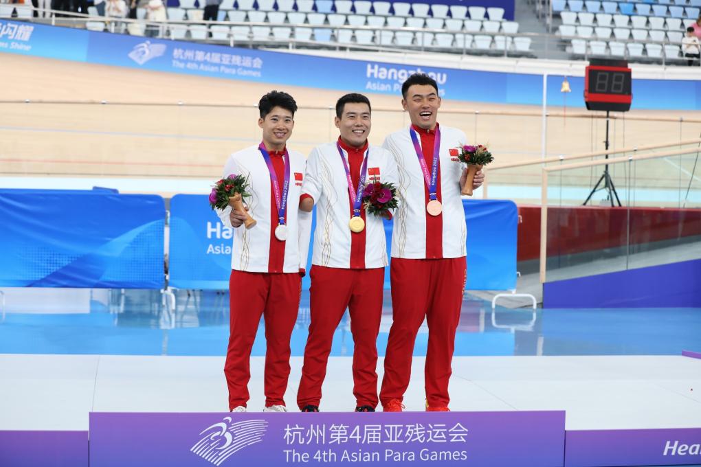 男子个人C4-5级1000米计时赛,中国选手展现出强大实力,吴国庆、赖善章、谭泽强将前三名收入囊中。赛后谭泽强表示,赛前队友们就已经打定主意,要让三面国旗同时飘扬在赛场上。冠军吴国庆认为,其实这个项目几名中国选手的实力都很强,谁都有可能拿冠军,“不过我们商量好了,不能让别人拿走金牌”。