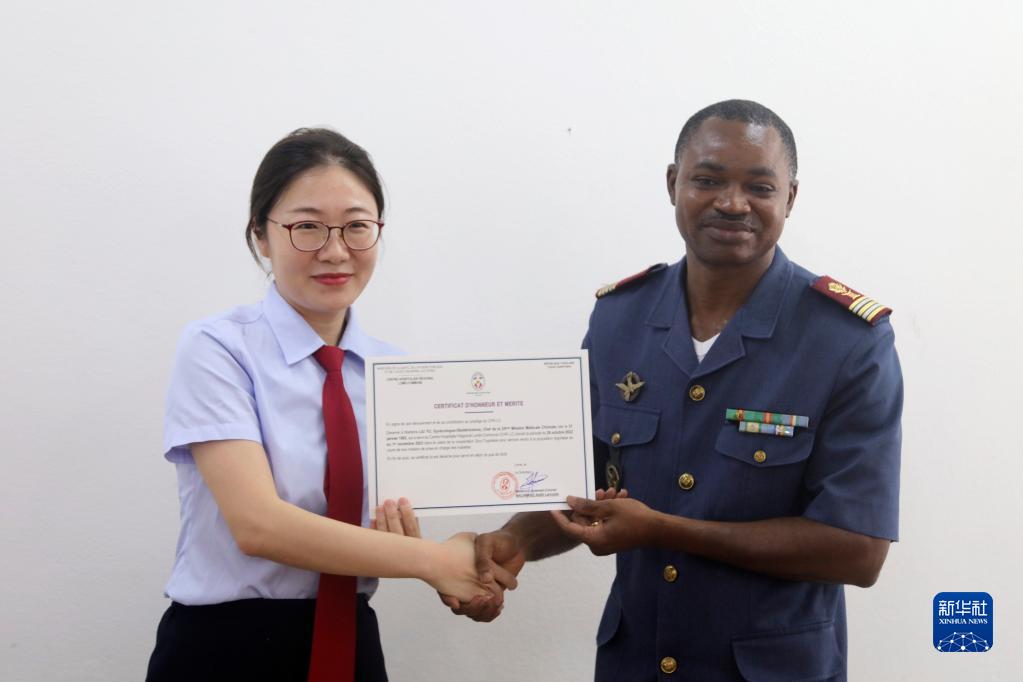 10月23日,在多哥洛美,洛美地区中心医院院长马卡曼齐·阿塔菲·拉鲁托基(右)向第25批援多哥洛美医疗队队长刘钰(左)颁发荣誉证书。新华社记者 孙毅 摄