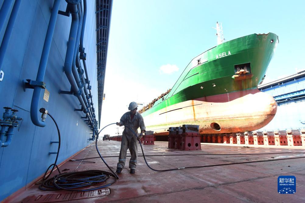 10月24日,在古巴哈瓦那港,一名工人在浮船坞甲板上工作。新华社发(华金·埃尔南德斯 摄)