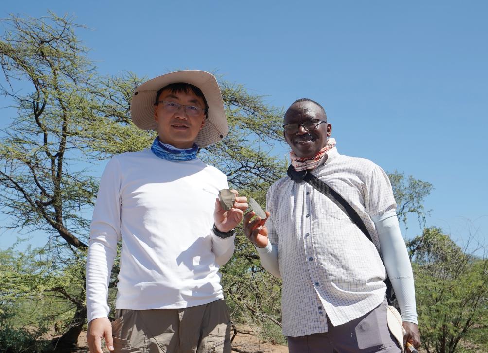 中方现场负责人赵清坡(左)与肯方负责人Job Kibii(右)展示新发现的典型勒瓦娄哇石核(左)和勒瓦娄哇尖状器(右)。中肯联合考古队供图
