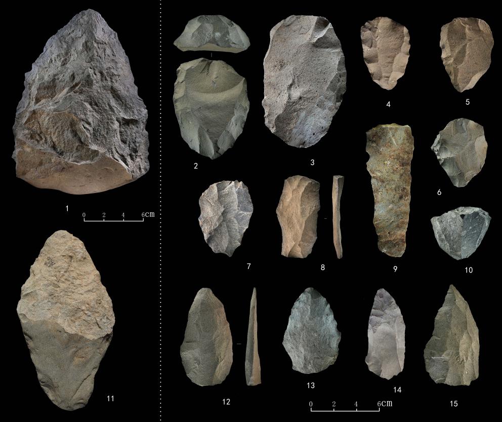 1.手斧 2-6.勒瓦娄哇石核(循环剥片法、优先剥片法) 7.勒瓦娄哇石片 8.勒瓦娄哇石叶 9.石叶 10.锥形石叶石核 11.手镐 12-15.勒瓦娄哇尖状器 中肯联合考古队供图