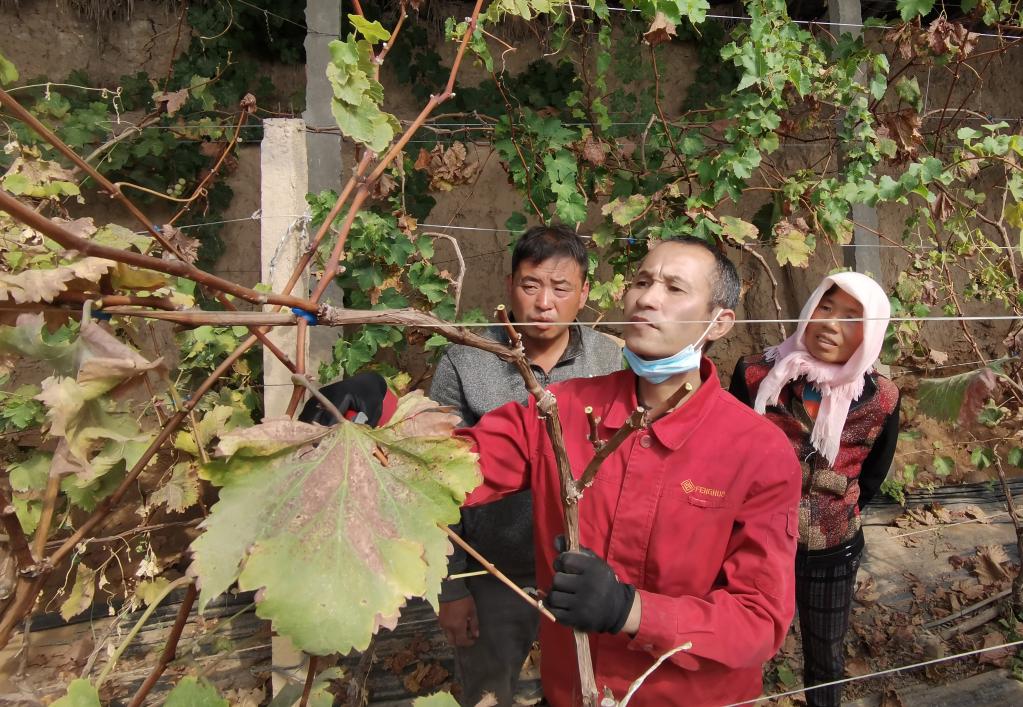 杨茂文在给村民讲解如何给新品种葡萄剪枝。新华社记者靳赫 摄