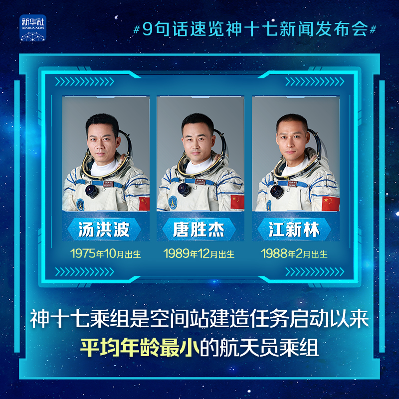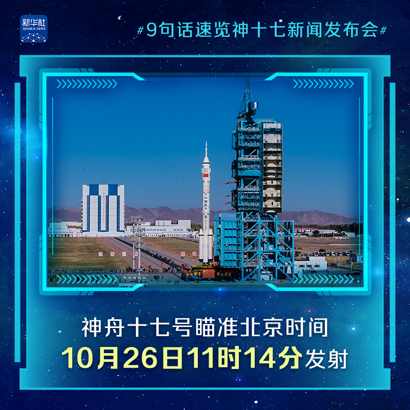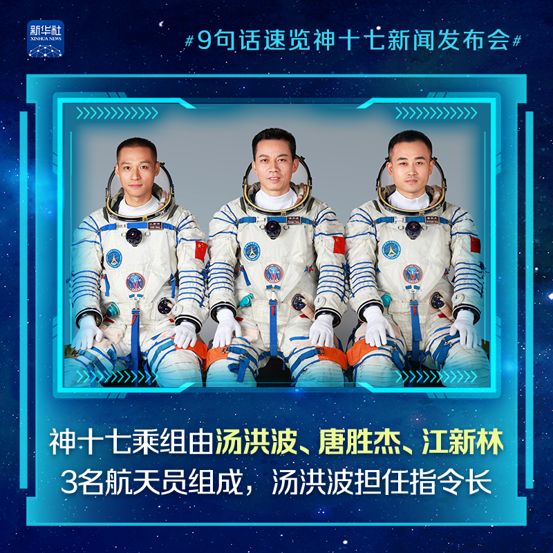 神舟十七号载人飞船瞄准北京时间10月26日11时14分发射,航天员乘组由汤洪波、唐胜杰和江新林3名航天员组成。25日上午,神舟十七号载人飞行任务新闻发布会在酒泉卫星发射中心举行。