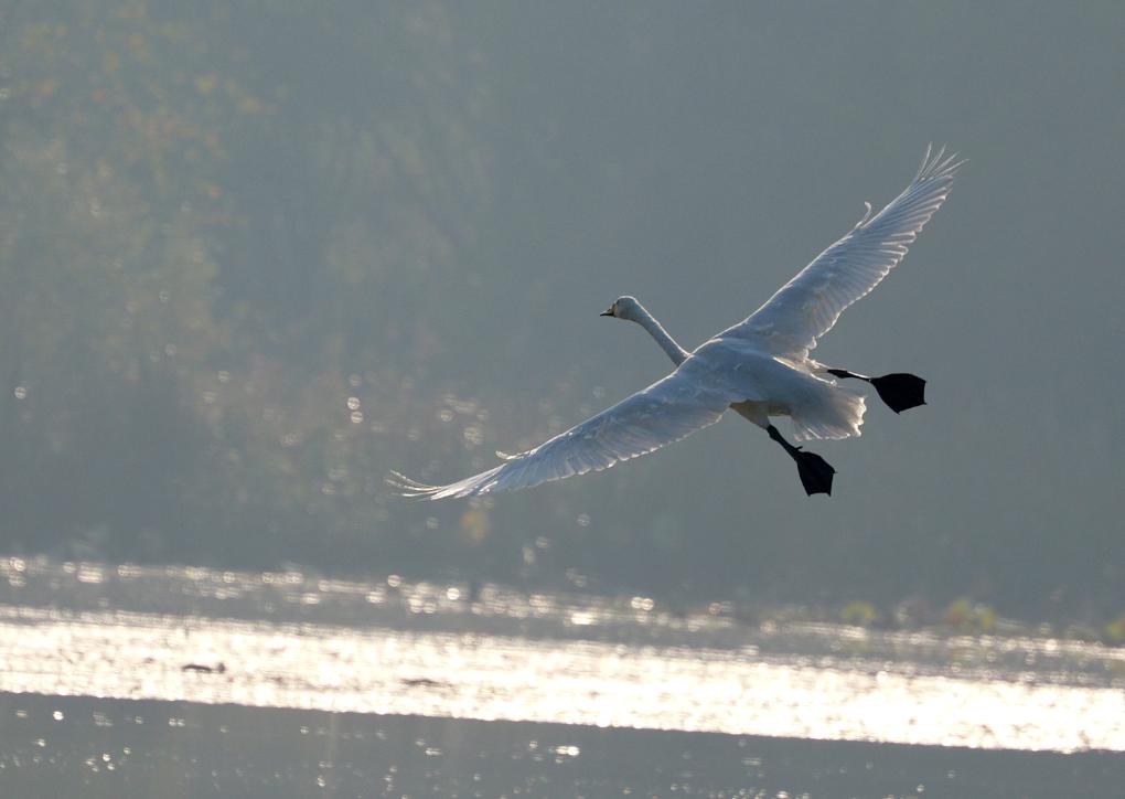 10月24日,大天鹅在三门峡市天鹅湖国家城市湿地公园内飞翔。新华社记者李嘉南 摄