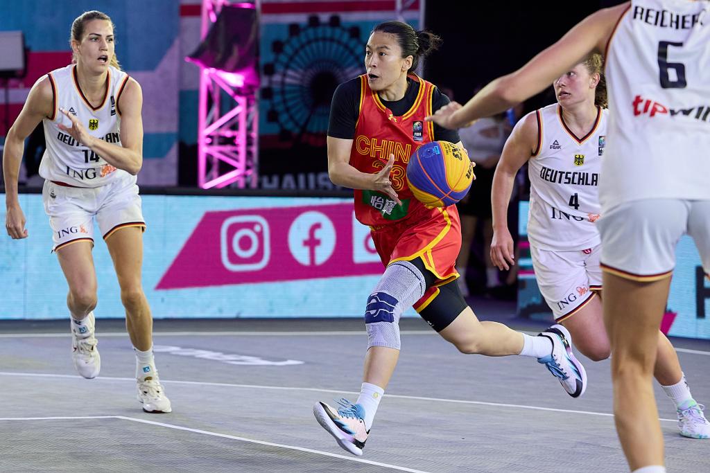 6月3日,中国队球员王丽丽(中)在2023国际篮联三人篮球世界杯女子组四分之一决赛中突破。新华社发(乔治斯·施耐德摄)