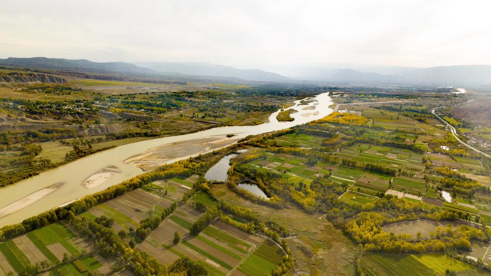 金秋时节,黄河上游的青海省海南藏族自治州贵德县黄河两岸层林尽染,秋色迷人,清澈的河水与周围景物、村庄相互映衬,勾勒出奇美壮丽的黄河画卷。