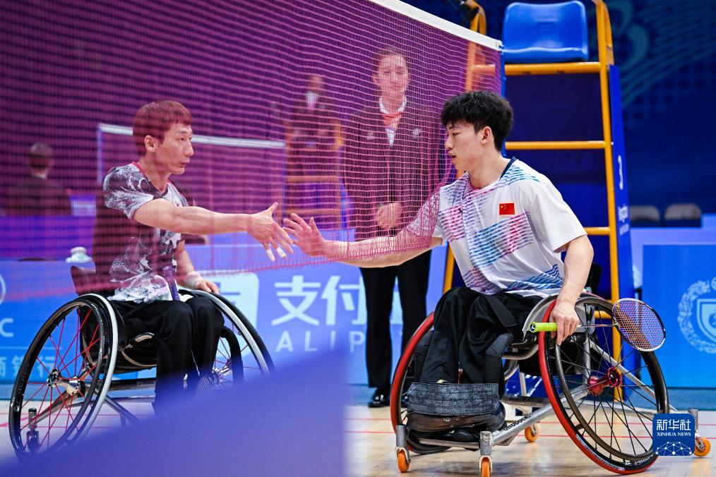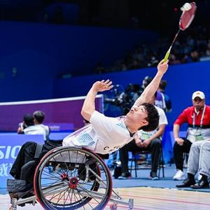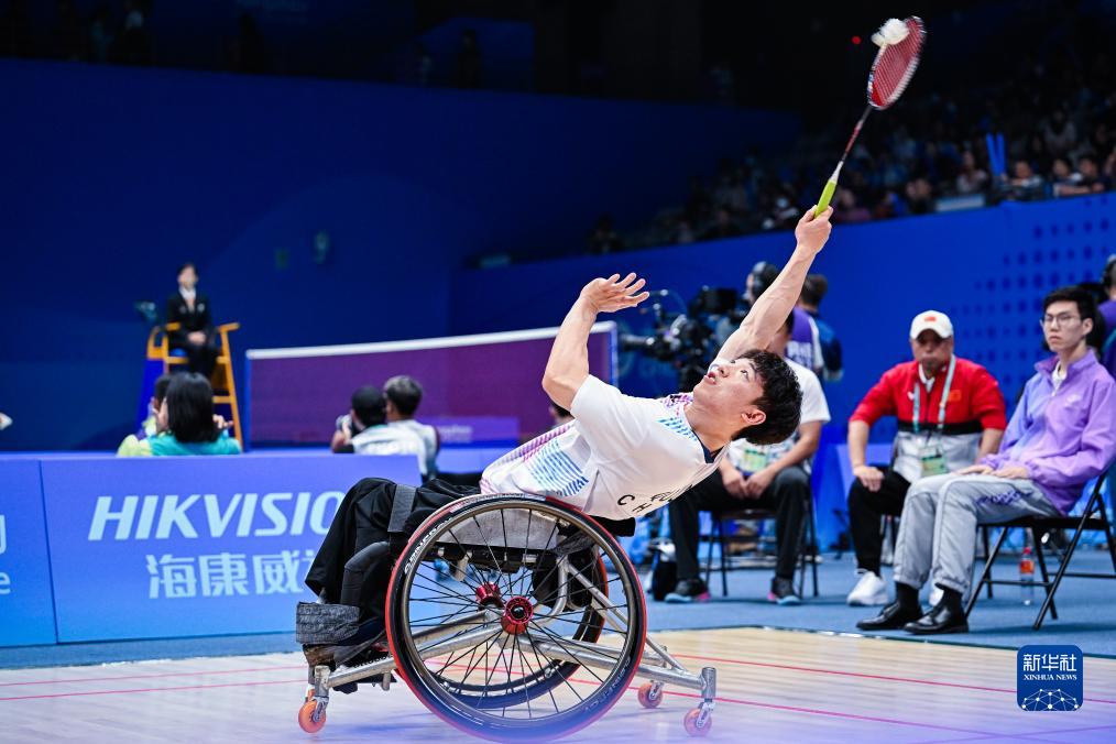 当日,在杭州第4届亚残运会羽毛球项目男子单打WH1级决赛中,中国选手屈子墨以2比0战胜韩国选手崔正晩,夺得冠军。