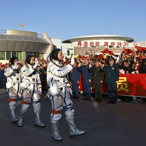10月26日上午,身着乳白色舱内航天服的3名航天员,在万众瞩目下,从酒泉卫星发射中心问天阁出征太空。