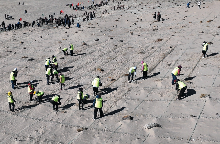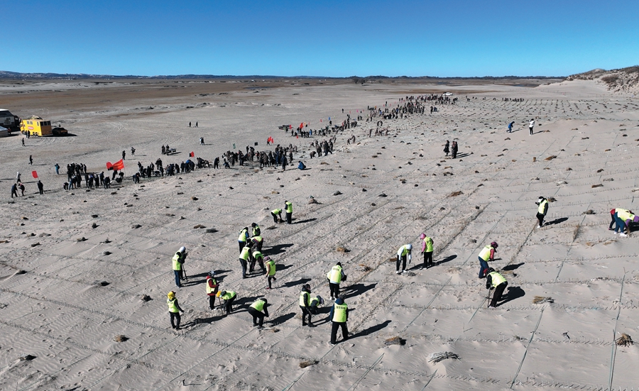 内蒙古浑善达克沙地正在设置沙障。新华社记者李云平 摄