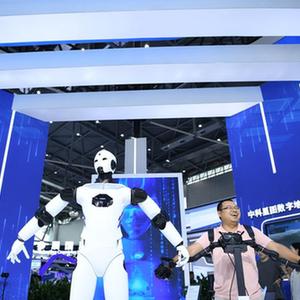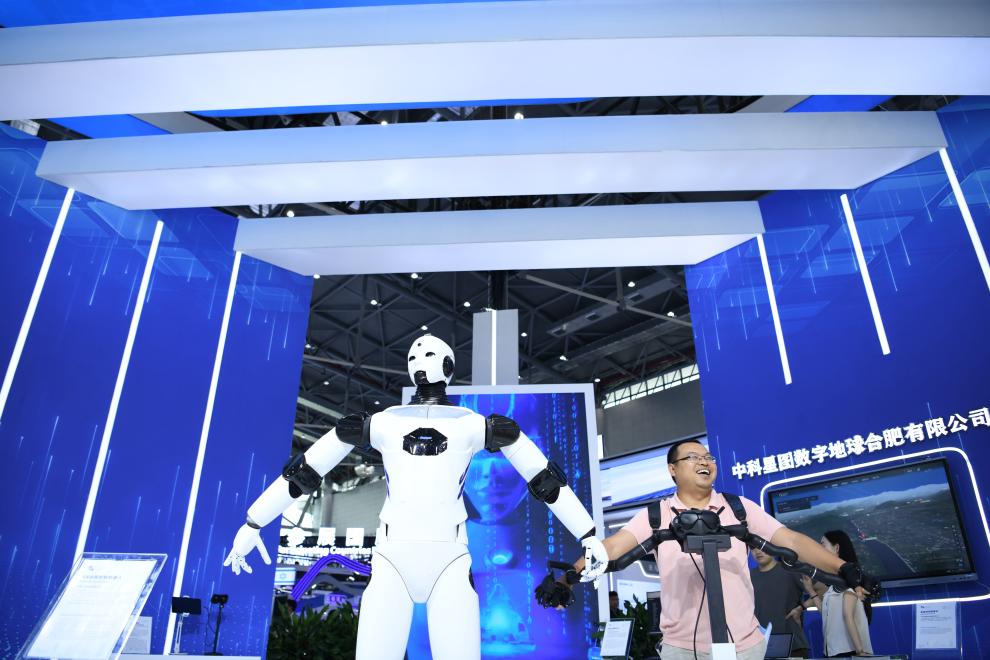 9月20日,在2023世界制造业大会上,观众在体验一款VR远程抓取机器人。新华社记者张端 摄