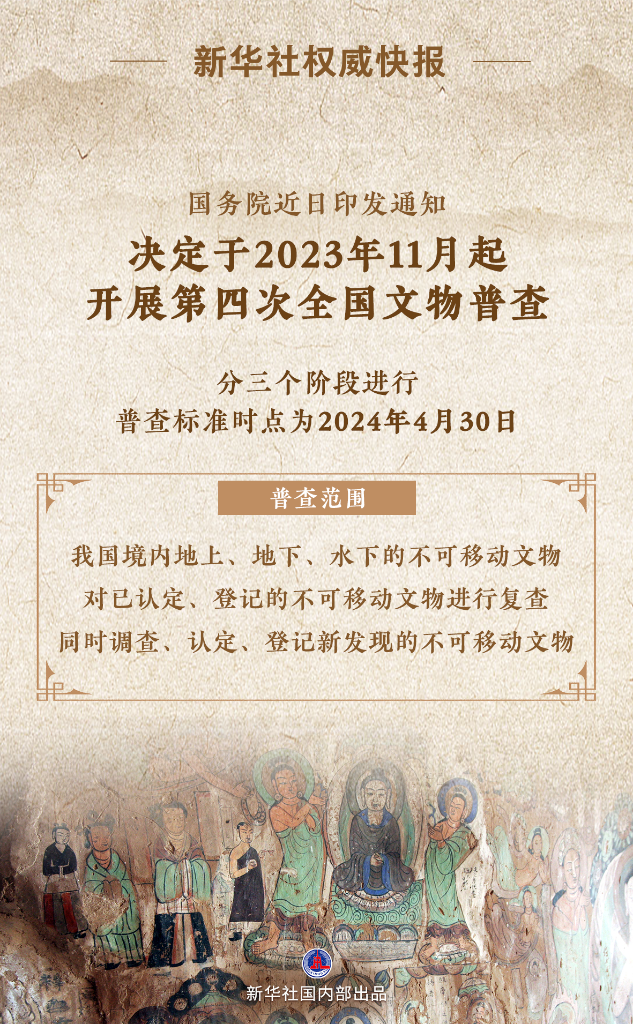 新华社北京10月27日电 国务院近日印发《关于开展第四次全国文物普查的通知》(以下简称《通知》),决定于2023年11月起开展第四次全国文物普查。