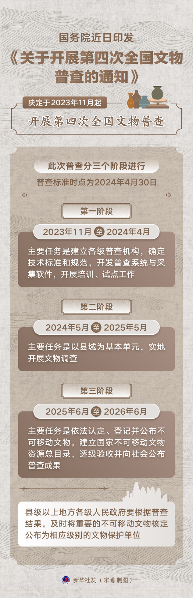 此次普查分三个阶段进行。普查标准时点为2024年4月30日。2023年11月至2024年4月为第一阶段,主要任务是建立各级普查机构,确定技术标准和规范,开发普查系统与采集软件,开展培训、试点工作;2024年5月至2025年5月为第二阶段,主要任务是以县域为基本单元,实地开展文物调查;2025年6月至2026年6月为第三阶段,主要任务是依法认定、登记并公布不可移动文物,建立国家不可移动文物资源总目录,逐级验收并向社会公布普查成果。县级以上地方各级人民政府要根据普查结果,及时将重要的不可移动文物核定公布为相应级别的文物保护单位。