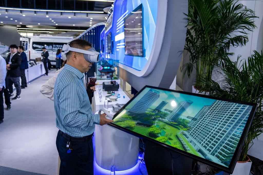 10月26日,在株洲国际会展中心,观众穿戴VR设备体验利用北斗技术辅助建模的地图仿真模型。 新华社记者 陈思汗 摄