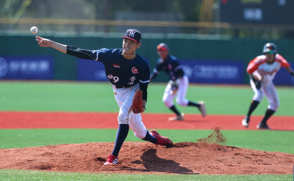 10月25日,在第一届全国学生(青年)运动会棒球比赛中,香港队投手正在投球。