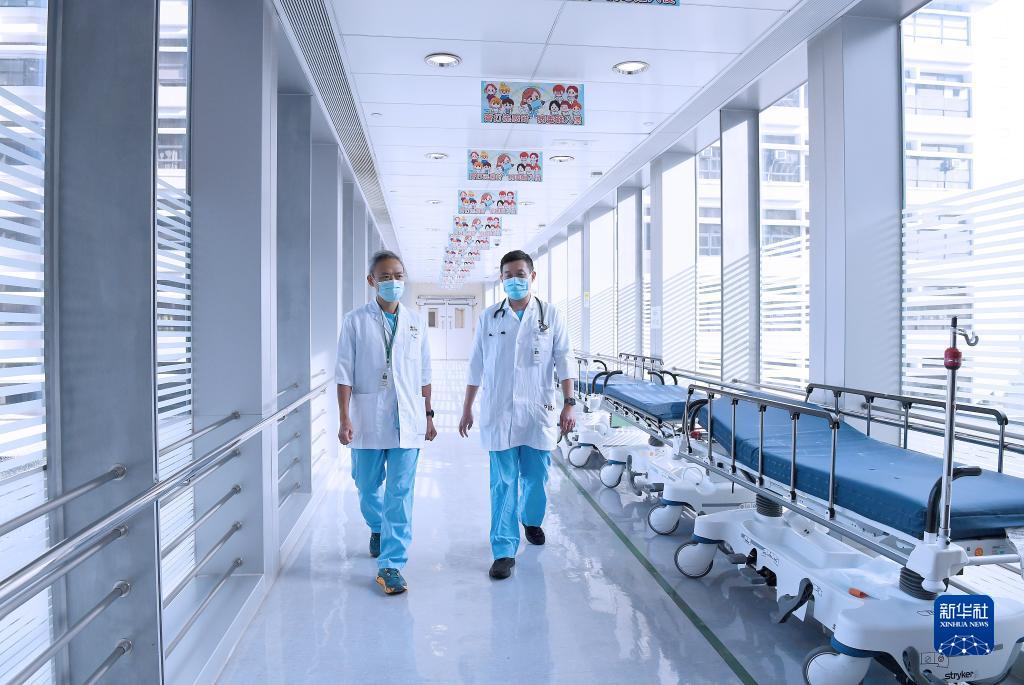 10月12日,匡煜坤(右)与杨耀昌从玛嘉烈医院的走廊走过。新华社记者 陈铎 摄