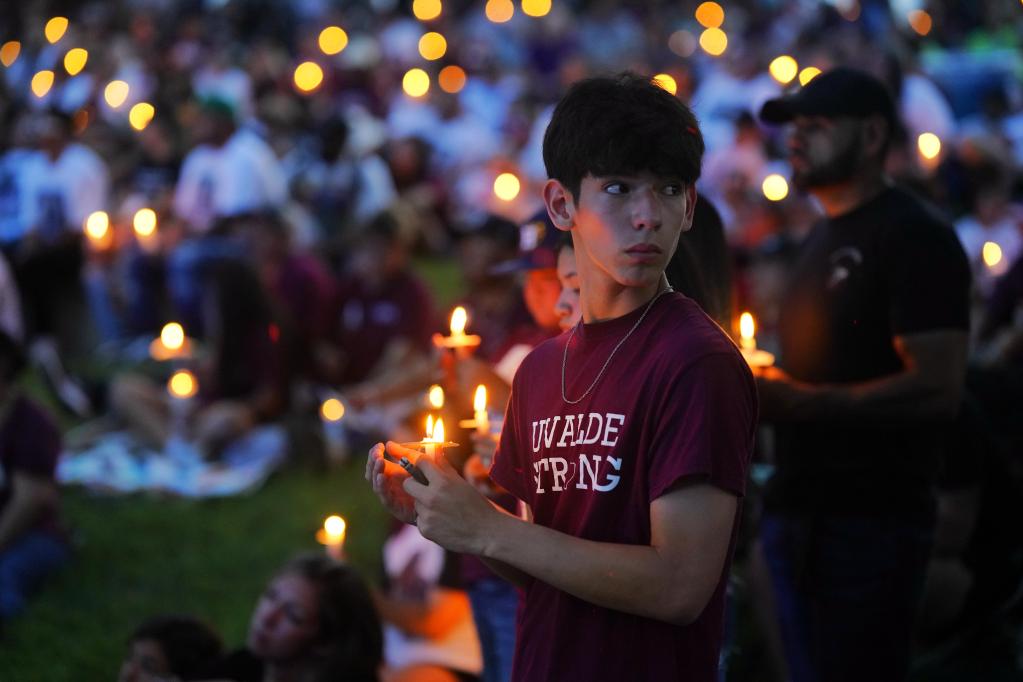 5月24日,在美国得克萨斯州小城尤瓦尔迪,人们参加守夜仪式悼念校园枪击遇害者。当日是美国尤瓦尔迪大规模校园枪击事件一周年。新华社记者吴晓凌摄