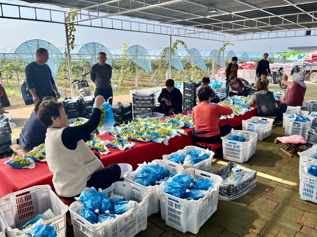 贵家营村党支部书记尉忠朝说,去年以来,村里的农业专业合作社与山西一家化肥公司合作,企业负责苗木栽植、滴灌设施、大棚搭建等工作,联合种植450亩阳光玫瑰葡萄,项目带动全村80余名劳动力就业,一年为村集体增收5万元左右。