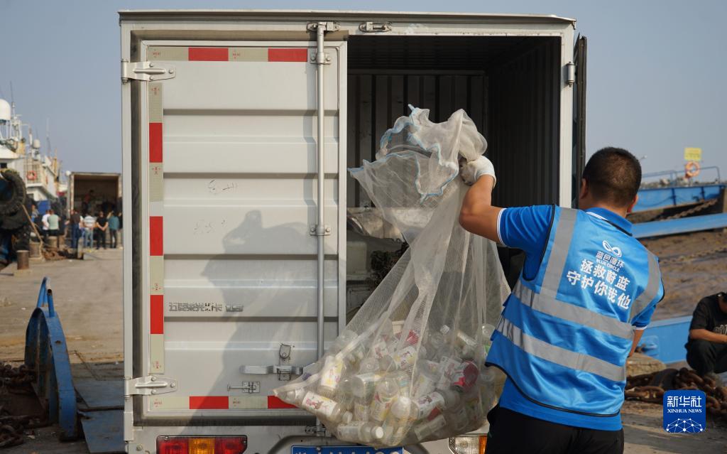 10月17日,工作人员在浙江台州的海边收集废弃塑料瓶。新华社记者 林光耀 摄