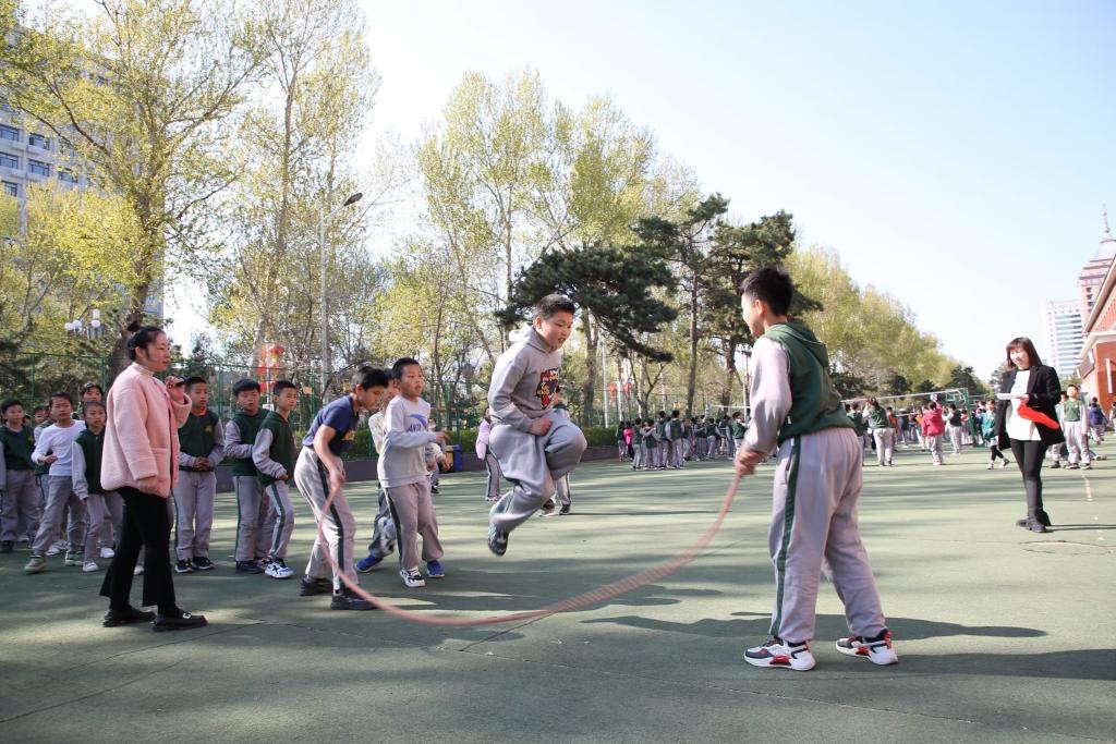 长春市外国语实验学校小学部学生课间在操场跳绳。(受访者供图)