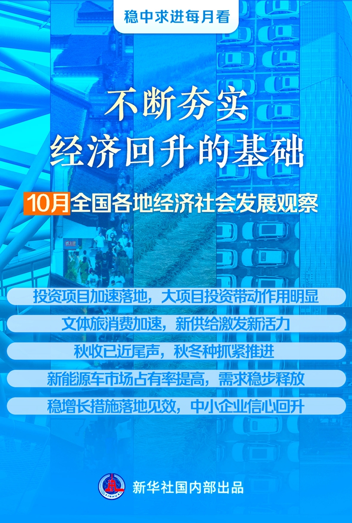 投资项目加快落地、文体旅消费热度攀升、中小企业信心回升……随着一系列政策组合拳加快落地实施,10月份各地加快推进经济社会发展。进入四季度,各方坚定信心,落实好经济社会发展各项重点任务,不断夯实经济回升的基础,为实现全年发展目标打下坚实基础。