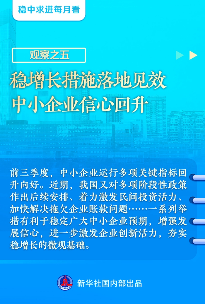 【记者观察】前三季度,中小企业运行多项关键指标回升向好。近期,我国又对多项阶段性政策作出后续安排、着力激发民间投资活力、加快解决拖欠企业账款问题……一系列举措有利于稳定广大中小企业预期,增强发展信心,进一步激发企业创新活力,夯实稳增长的微观基础。