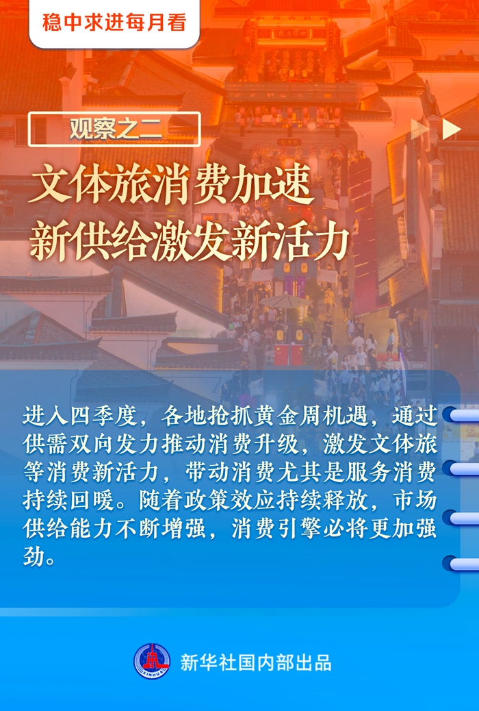 10月是传统的消费旺季。今年中秋国庆期间,全国超8亿人次出游、国内旅游收入超7500亿元;文体旅融合趋势明显,上海迪士尼乐园、西安秦始皇帝陵博物院、武汉黄鹤楼等文化地标成为热门目的地。