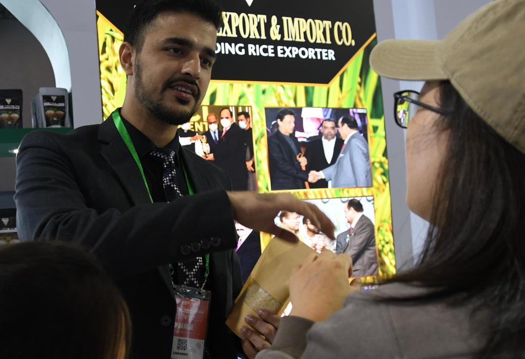 10月28日,在第九届四川农博会上,巴基斯坦阿米尔(AMIR)稻米进出口公司负责人(左)正在向参会人员介绍稻米产品。新华社记者 高健钧 摄