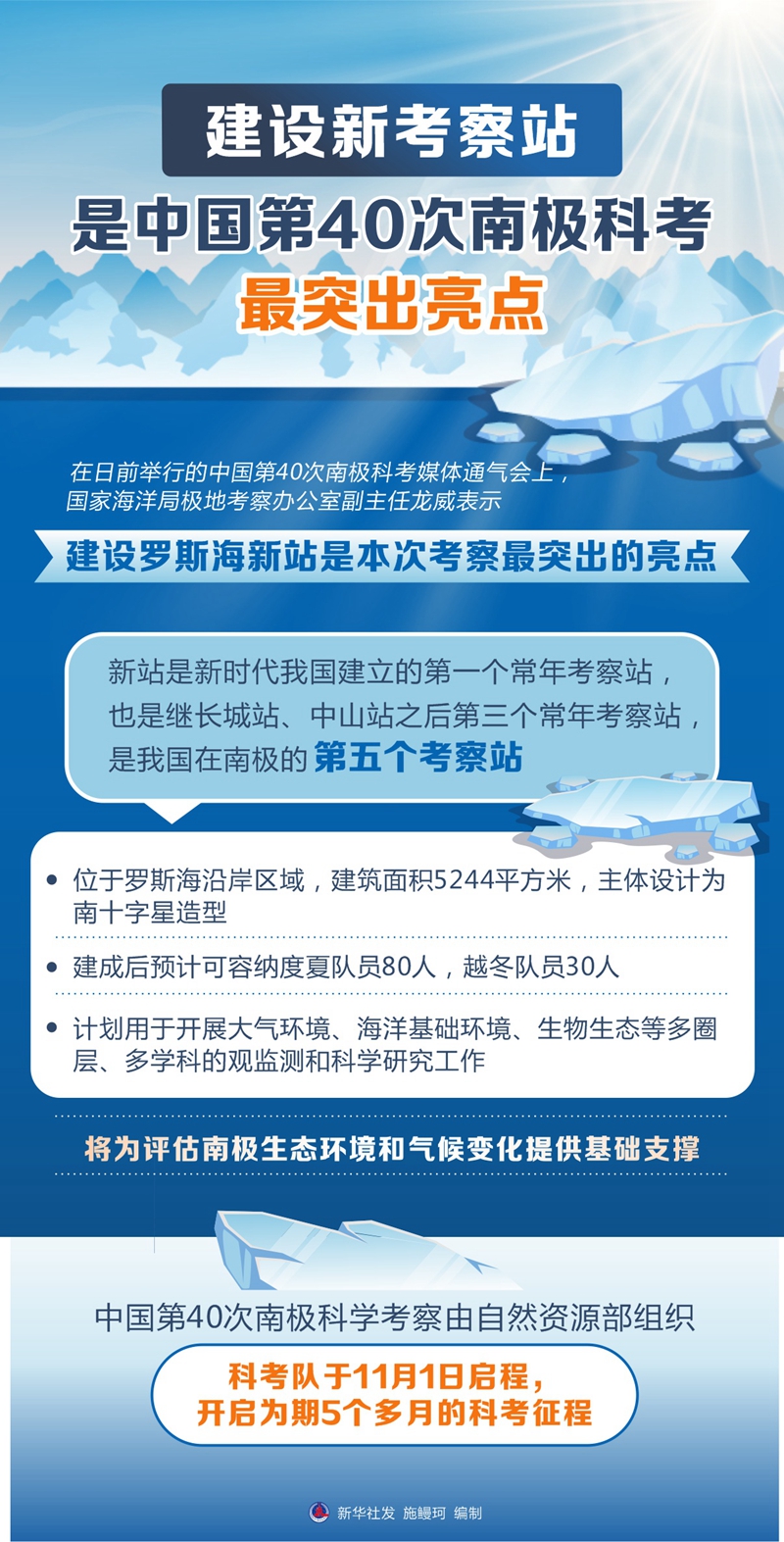 新华社上海11月1日电 “建设罗斯海新站是本次考察最突出的亮点。”在日前举行的中国第40次南极科考媒体通气会上,国家海洋局极地考察办公室副主任龙威表示,新站是新时代我国建立的第一个常年考察站,也是继长城站、中山站之后第三个常年考察站,是我国在南极的第五个考察站。