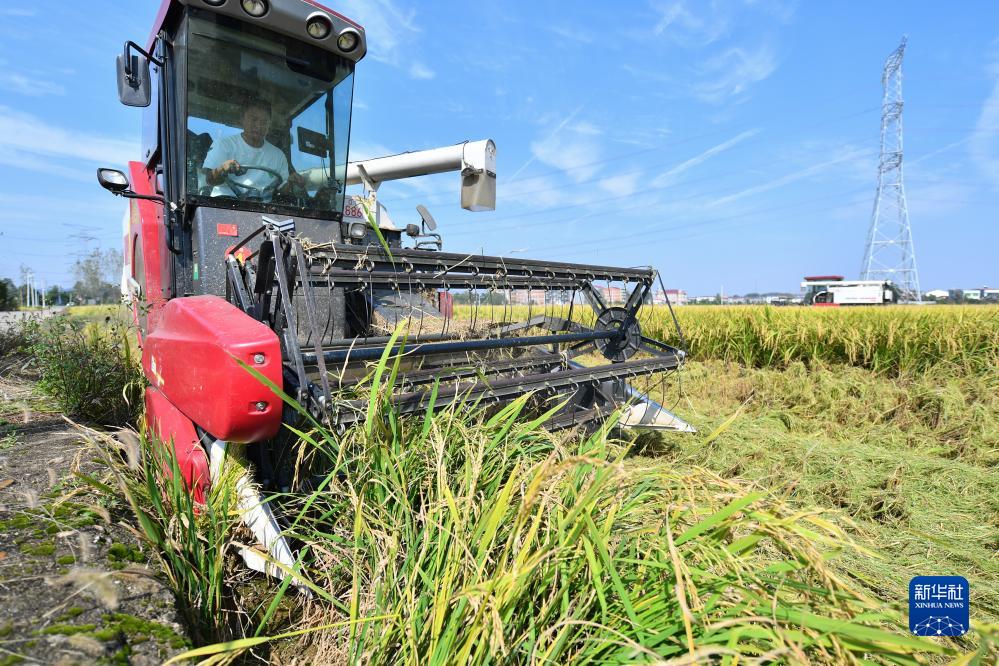 近日,湖南省浏阳市农业大镇龙伏镇种植的晚稻进入成熟收割阶段,当地运用智能化机械设备展开作业,助力秋粮颗粒归仓。