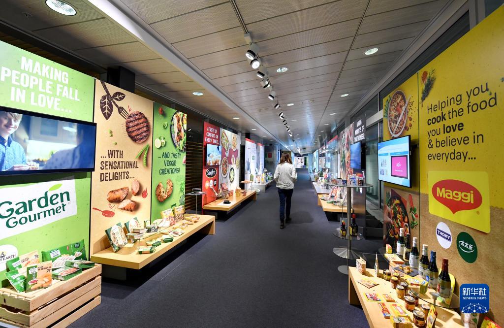 10月31日,在瑞士沃韦的雀巢总部,工作人员走过全球产品展示廊。