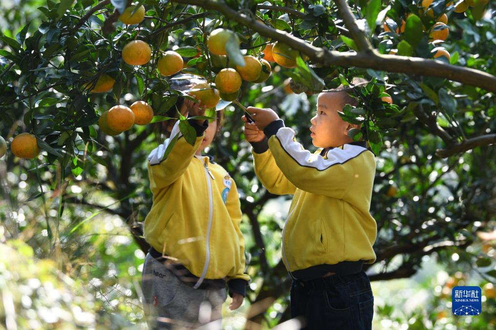11月1日,贵州省黄平县新州镇第二幼儿园小朋友在校外劳动实践基地采摘柑橘。