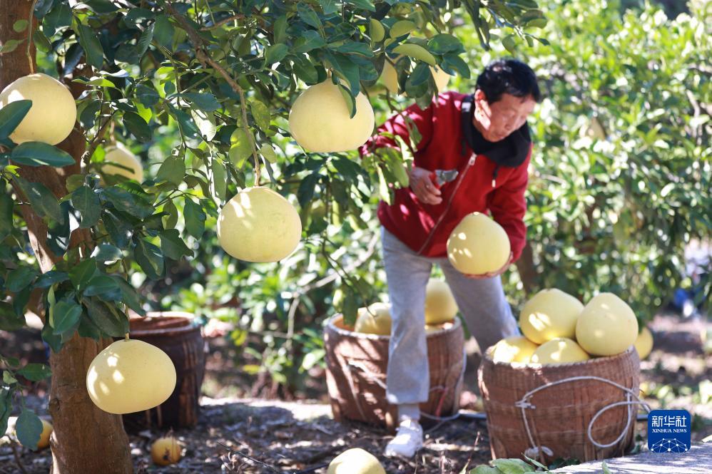 11月1日,村民在贵州省岑巩县注溪镇周坪村思州柚种植基地采收柚子。