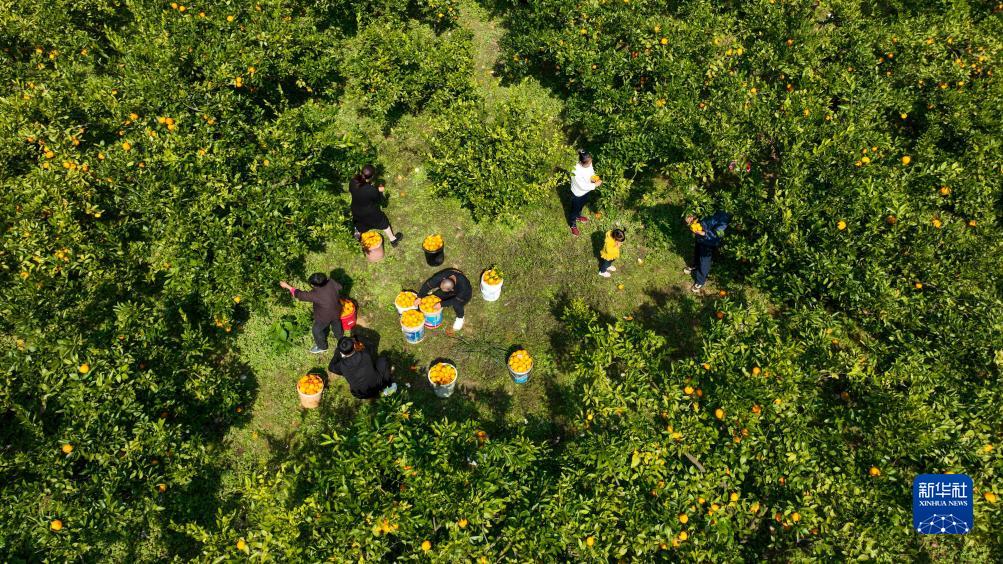 11月1日,果农在贵州省开阳县南龙乡土香村柑橘种植基地采摘、分拣柑橘(无人机照片)。