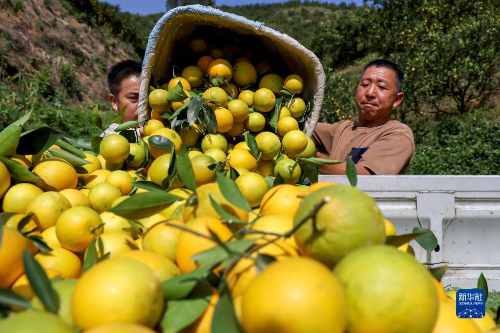 11月1日,村民在贵州省罗甸县龙坪镇顶访村脐橙种植基地将脐橙装车。