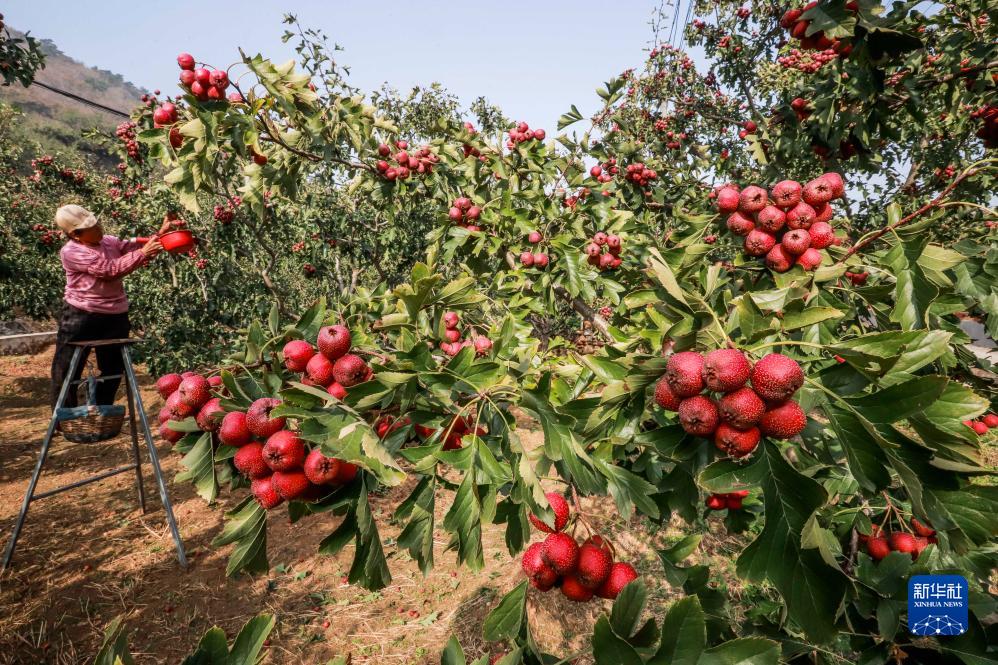 10月30日,河北省遵化市地北头镇鲁家峪村农民在果园采摘山楂。