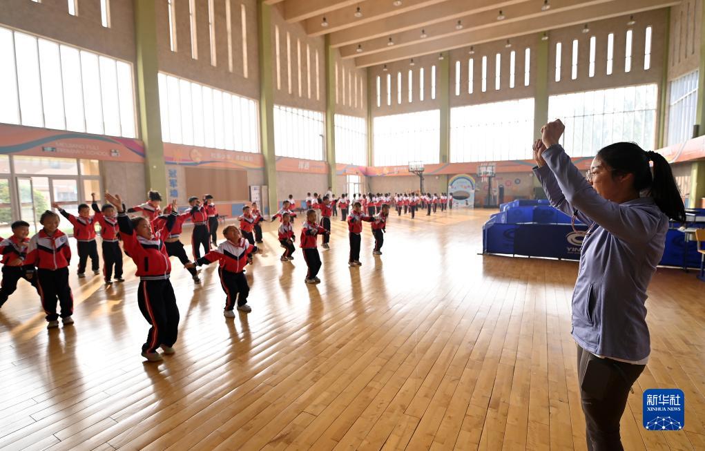 11月1日,在天津市西青区梅江富力小学,体育老师带着学生在室内进行体育锻炼。