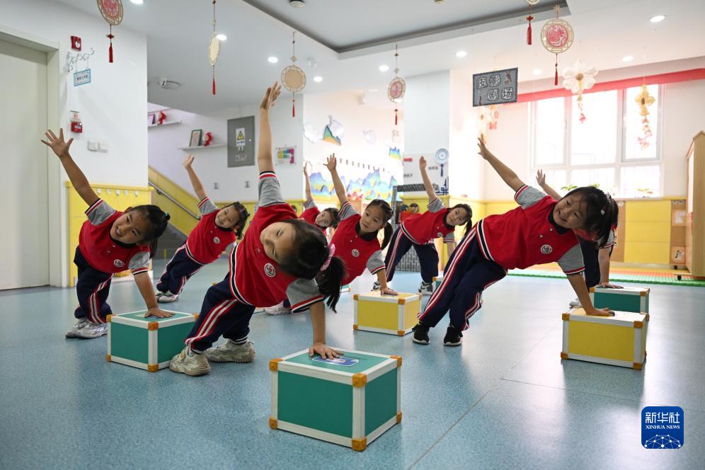 11月1日,天津市和平区第五幼儿园的小朋友在室内进行体育锻炼。