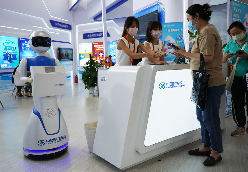 2022年9月4日,在服贸会首钢园区金融服务专题展上,参观者在中国民生银行展台咨询金融业务。新华社记者 金皓原 摄